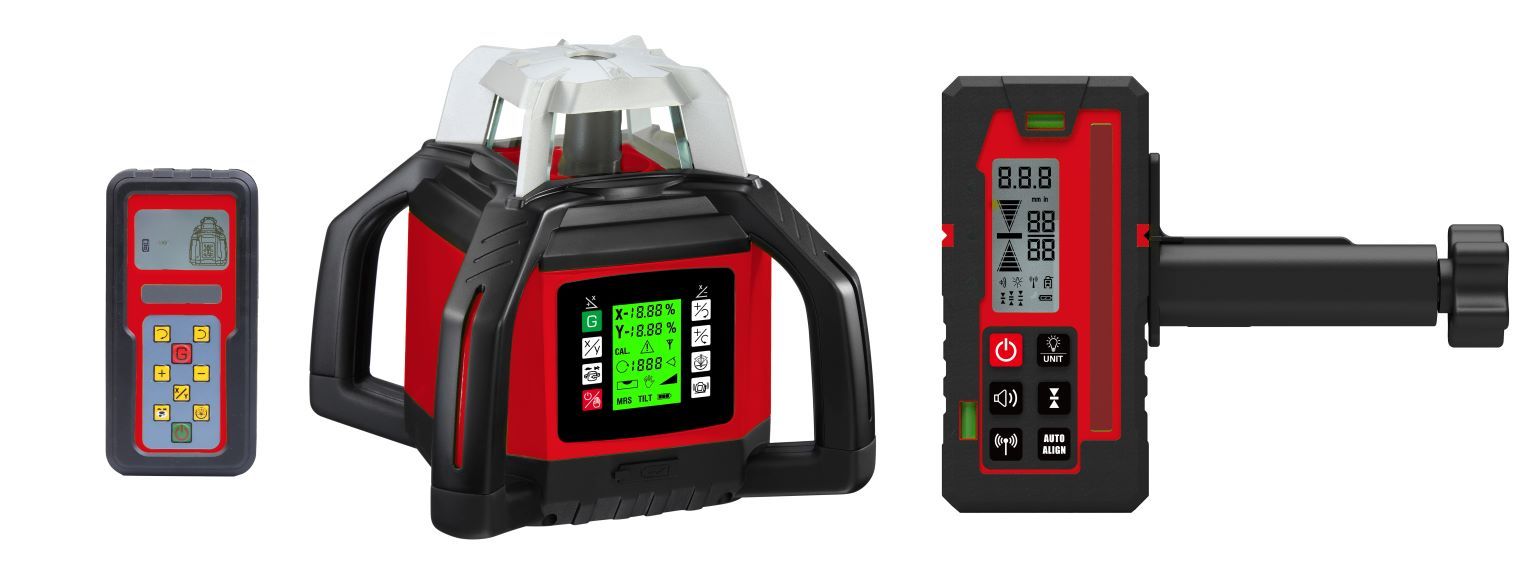 The GR-RA model also includes an LCD display on the remote control. With the remote control, for example, tilts can be adjusted without the need to walk to the laser. The display on the remote control shows the set tilt as numbers directly.